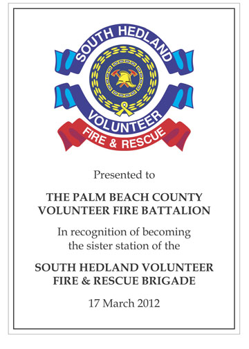 The Palm Beach County Fire Rescue Reserve Battalion is proud to have the South Hedland Volunteer Fire & Rescue Service as a sister station. South Hedland is a suburb of Port Hedland in Western Australia.